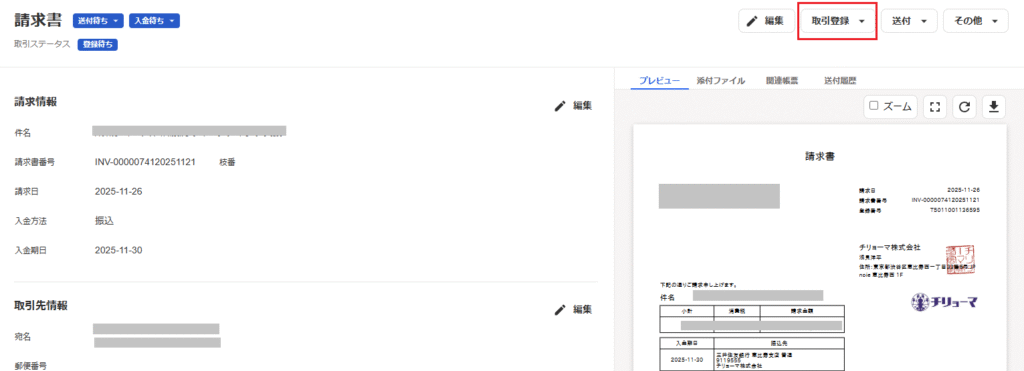 5.表示された個別画面右上の赤枠内「取引登録」をクリック