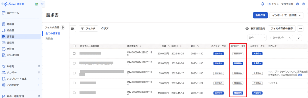 3.赤枠内「取引ステータス」を確認し、「登録待ち」となっているものが対象となる